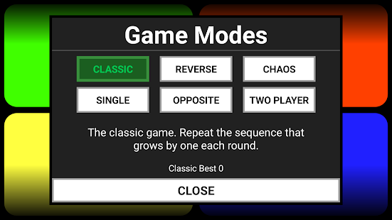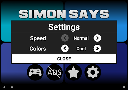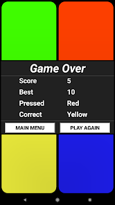 A simple yet fun memory game of colors and tunes. Boost your brain power with this visual, auditory, and kinetic exercise! Red, Blue, Yellow, Green, plus extra color sets to choose from as well as a range of speed settings. Try upping the speed to Insane for a terrifying challenge.