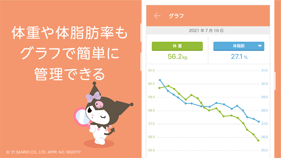 体重記録はもちろん、体脂肪率、お通じや生理日なども記録ができます。また記録した体重や体脂肪率の推移がグラフで表示されるのでダイエットの減量の成果が一目でわかります。体重記録をしながら健康管理する機能も充実したアプリです。