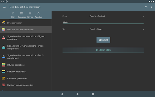 Byte conversion - Dec, bin, oct, hex conversion - Signed number representations: Signed magnitude, One's complement, Two's complement - Bitwise operations - Shift and rotate bits - Password generation - Password strength check - Random number generation - Base 64 encoding / decoding - URL encoding / decoding - MD5, SHA, CRC-32 hash generation - Unix Timestamp conversion - POE calculation - Subnet calculation - Data transfer time - Wake on lan - RGB/HEX conversion