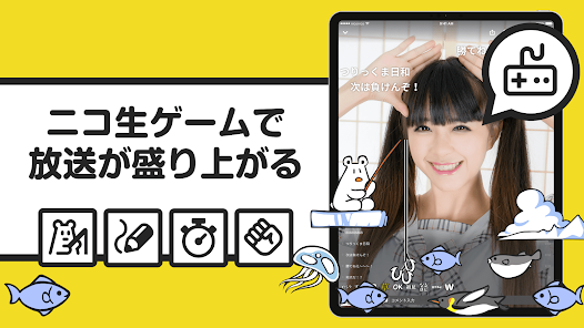 映像上のコメント表示に加え、視聴者と放送者が対戦できるゲームや、お絵かき機能・モザ