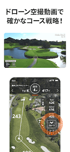距離が一発でわかるマップとドローン動画で確かな戦略をGPSコースマップ機能が提供!Google Mapsの航空写真を利用した距離計測とドローン空撮動画での詳細なコースレイアウトの把握により、GPSによる戦略的なゴルフをサポートします。