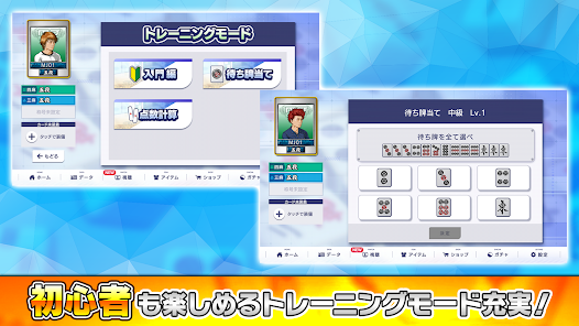 トレーニングモードで麻雀の基本ルールから役、点数計算まで学べるから、麻雀知らなくても大丈夫