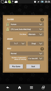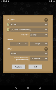 ・盤面サイズ(5x5、6x6、7x7、8x8、9x9)や盤面テーマ(将棋、チェス、リバーシ)の設定が可能です。