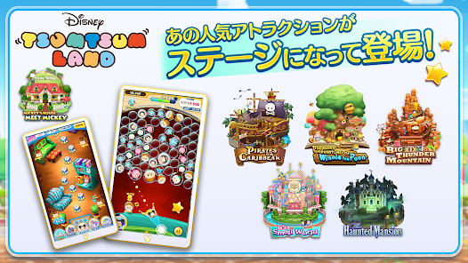イッツ・ア・スモールワールドやカリブの海賊、ホーンテッドマンションなど人気アトラクションのステージで、バブルをねらってツムを飛ばす、“はじける”パズルゲームです♪