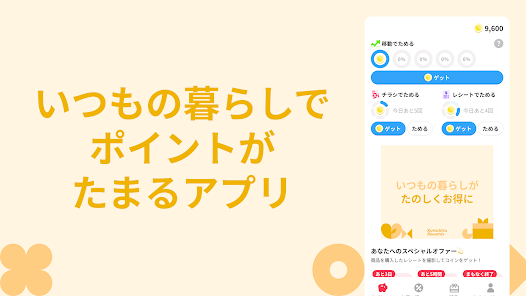 クラシルリワードは、日常生活のついでにポイントがたまるお得なアプリです。移動距離や特売情報(チラシ)の閲覧数、お買い物後のレシートの送信数に応じてアプリ内のコインを獲得し、ためたコインは様々な特典(他社ポイント・デジタルギフト・電子マネーなど)と交換することができます。