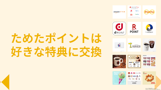 ・ためたコインは、様々な他社ポイント・デジタルギフト・電子マネーなどと交換することができます。(Amazonギフト券、楽天ポイント、Tマネー、dポイント、Pontaポイント、nanacoポイント)