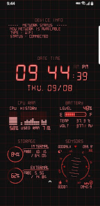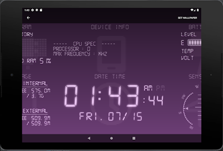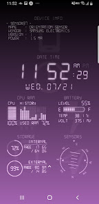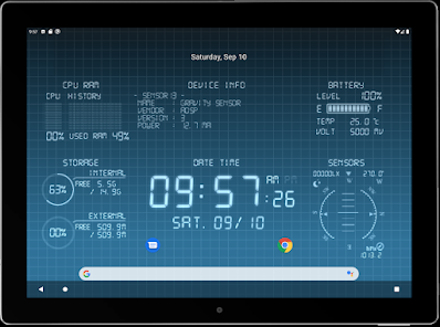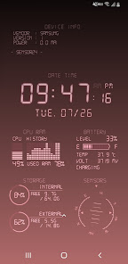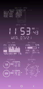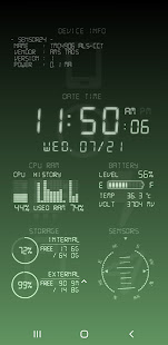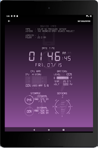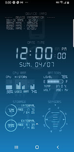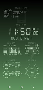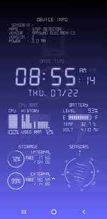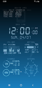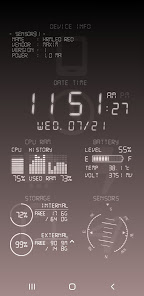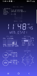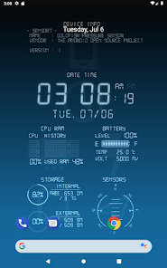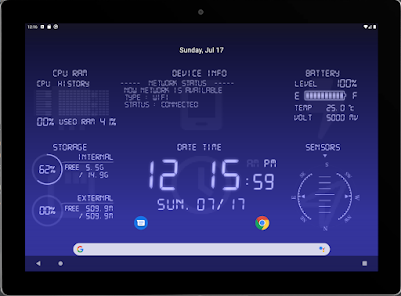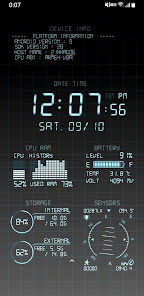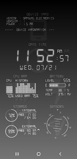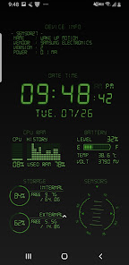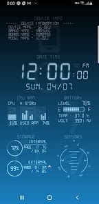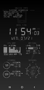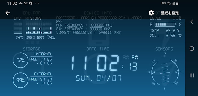 デジタル時計やバッテリー残量、CPU負荷状態、メモリやストレージの使用量、方位磁石、周囲の明るさ、お使いのスマホにセンサーがあれば歩数計(万歩計)、現在の気圧などが同時に表示されるので、まとめて確認することができます。