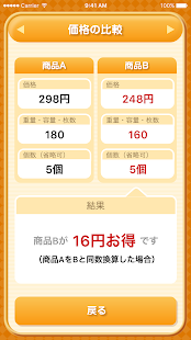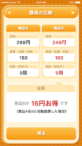 価格比較、割引計算、100g価格計算、およびメモ機能が備わっています。