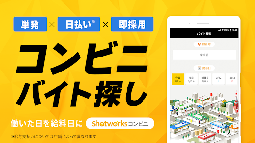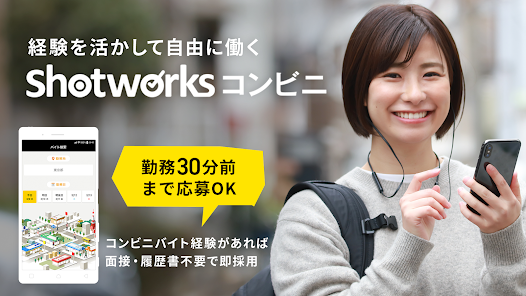 ツナググループHCの運営する国内最大クラスの短期・単発バイト アルバイト情報サイト「shotworks(ショットワークス)」のコンビニバイト専門ショットワークスコンビニのAndroidアプリです。