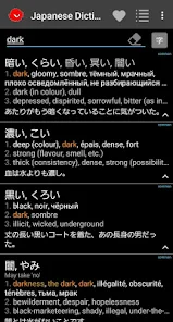 オフラインの日英辞書と日本語学習学習ツール。単語ごとに例文、漢字情報、活用形を収録。一部の日本語の単語は、他の多くの言語にも翻訳されています (以下を参照)。