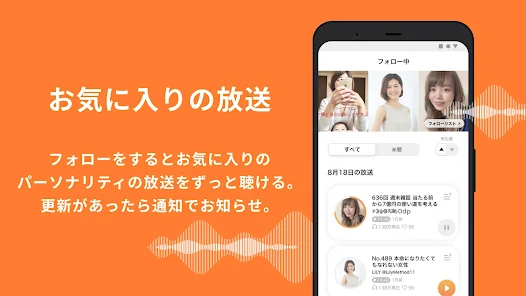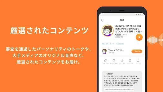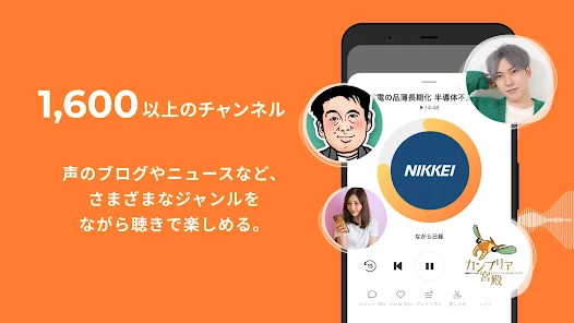 タレントやお笑い芸人、アイドルなどの芸能人からアーティスト、スポーツ選手、作家などの文化人、インフルエンサー、各分野の専門家、経営者、ワーキングマザーなど、あらゆるジャンルのパーソナリティがありのままを届けています。「声」だから、ここでしか聴けない話もたくさんプレミアムリスナーに参加すれば、クローズドな放送も聴けます一部有料。