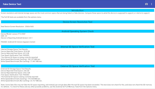 This app detects fake devices that have modified firmware which conceals the real/actual hardware specifications of the device. Other device testing apps will usually fail to report the true specifications on faked devices because they only report what the operating system tells them, which is fake specifications. This may be the only app on the play store that will report true device specifications because we do not rely on what the operating system is reporting, we find the true specs by running tests.