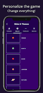 合計 20 以上のテーマと、ボール、パドル、レンガ用の 50 以上のスキンがあり、好みに合わせてゲームの外観を創造的に調整できます。たとえば、人気のあるテーマには星空、メリークリスマス、愛などがあります。ボールをバスケットボール、サッカー、ゴルフボール、さらには惑星に変更できます。パドルとレンガの形状、色、パターンも変更できます。