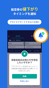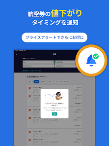 旅行先が決まったら、次は予約に最適な日程を探します。カレンダービューでは、選択した月の最安値の日付が表示されるため、最適なフライトを見つけることができます。まだ予約の準備ができていない場合は、プライスアラートを設定すると、飛行機の価格が変動した際に通知が届くため、常に適切なタイミングで航空券を予約できます。