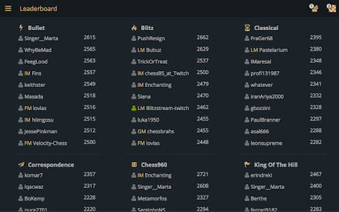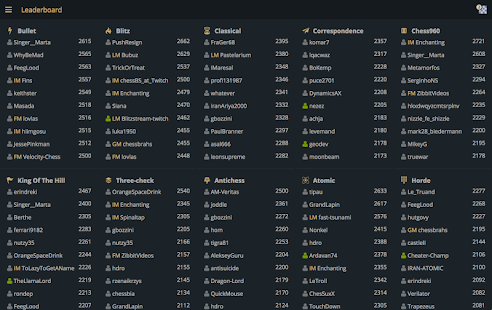 - オンラインとオフラインで利用できる多くのバリエーション:Crazyhouse、Chess 960、King Of The Hill、Three-check、Antichess、Atomic chess、Horde、Racing Kings