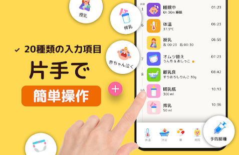 - 赤ちゃんのおしっことウンチを記録、脱水、便秘、下痢などに素早く対応できます