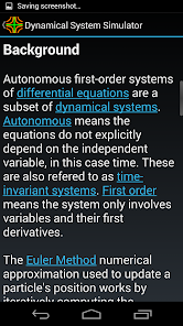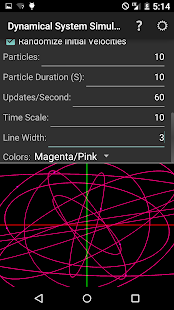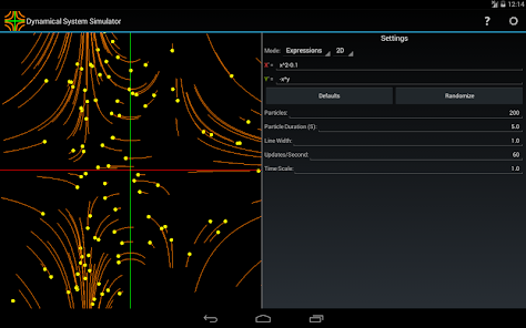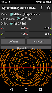 Dynamical System Simulator animates 2D and 3D first-order and second-order systems of differential equations in real time. Watch animated particles move through space leaving a trail in their wake. Great for verifying slope fields, phase portraits, and gaining an intuitive understanding of dynamical systems. Knowledge of differential equations is assumed but the help screen will point you to additional sources of information. The app is pre-loaded with several well known dynamical system configurations that can be selected from the navigation drawer. Parameters for a particular system type can be randomized.
