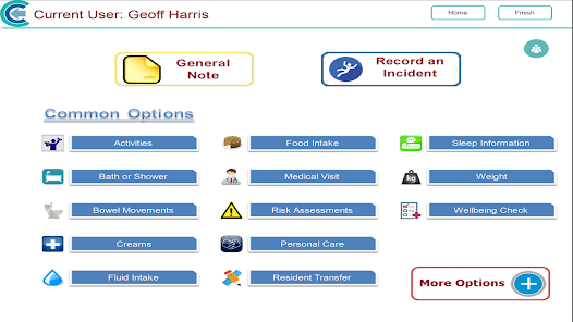 Medical Visits, Injury or Health Issues, Sleep Information, Bath or Showers, Food Intake, Behaviour, Cream Recording, Weight Monitoring, Activities, Fluid Intake, Observations, Bowel Movements, Intensive Care, Bed Changes, Movements, Personal Care, Air Mattress Settings, Menu Choice, General Notes
